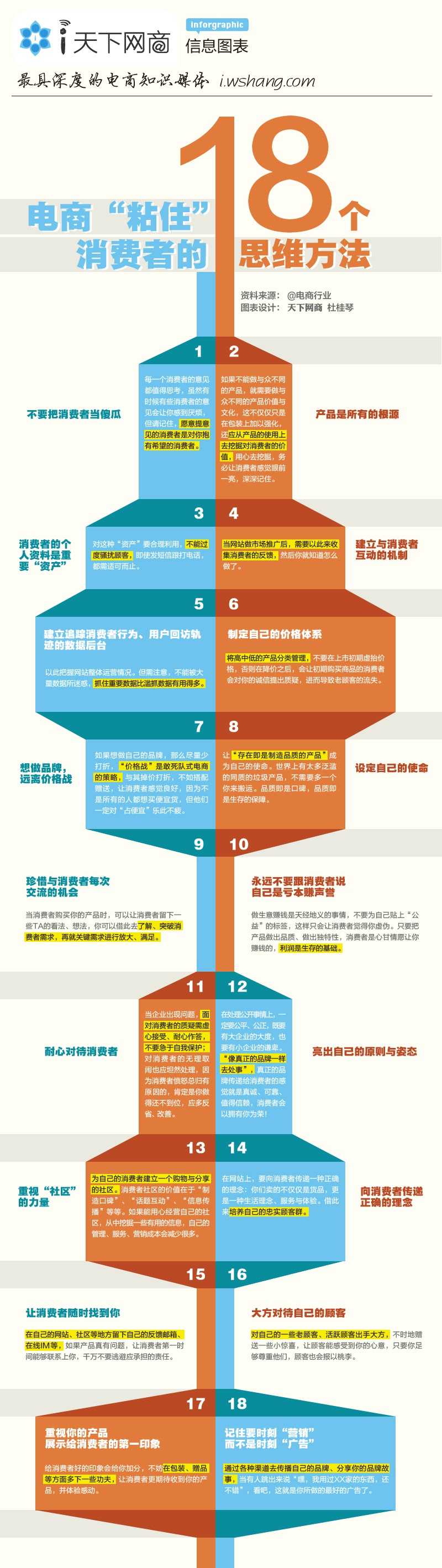 电商“粘住”消费者的18个思维方法–信息图 更多阅读:消费者八大常见购买动机–信息图关于80、90后消费者你该知道的事情–信息图你懂你的消费者吗?网络购物VS实体店–信息图BIG-Commerce:移动商务是否会取代电子商务?–信息图消费者购买心理剖析—数据信息图一图看懂少儿英语培训——消费者篇ASYMCO:透过硬件消费者价格指数看行业兴衰【舌尖上的科技–饮食消费行为】–数据信息图2013年美妆消费者购买习惯调查数据如何成为一个更理智的消费者2014年酒店业消费者需求研究CTR:2016年中国3.15消费者将聚焦哪个行业?尼尔森:2015年Q1中国消费者信心指数OIV:2023年世界葡萄酒及消费者报告哪个世代的消费者更热衷于中性风穿搭?