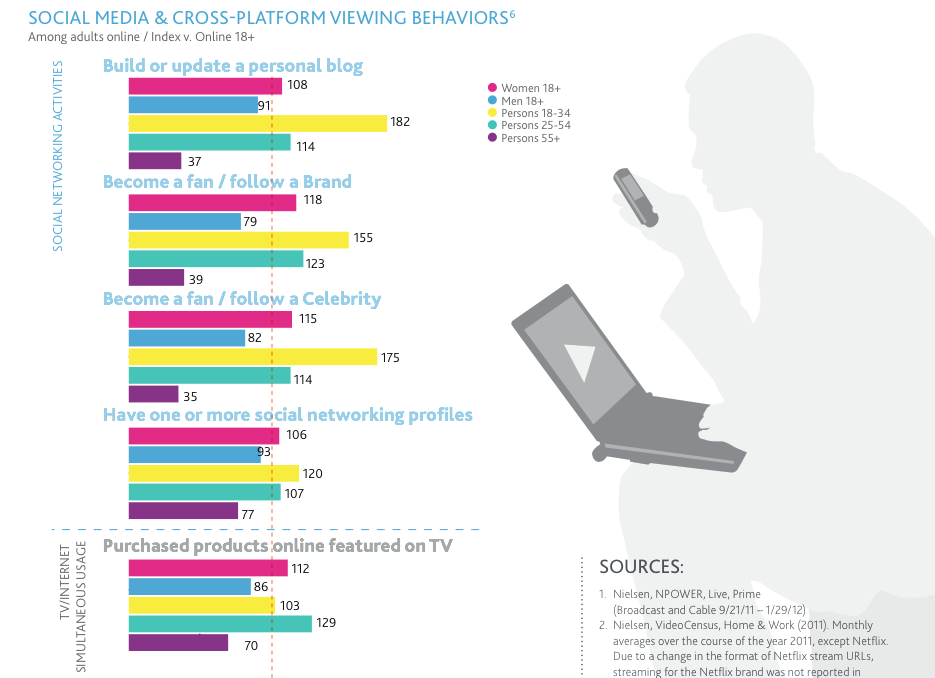 3)25-54的成年人有通过在网上购买电视上介绍过的产品的倾向,高出标准值index100的29