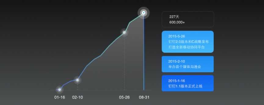 从钉钉正式发布到今天,200多天时间里,完全脱离销售(地推,电话营销)的情况下,钉钉已经吸引60多万家企业组织悄然入驻,且以每月新增10万家以上的速度稳步增长。