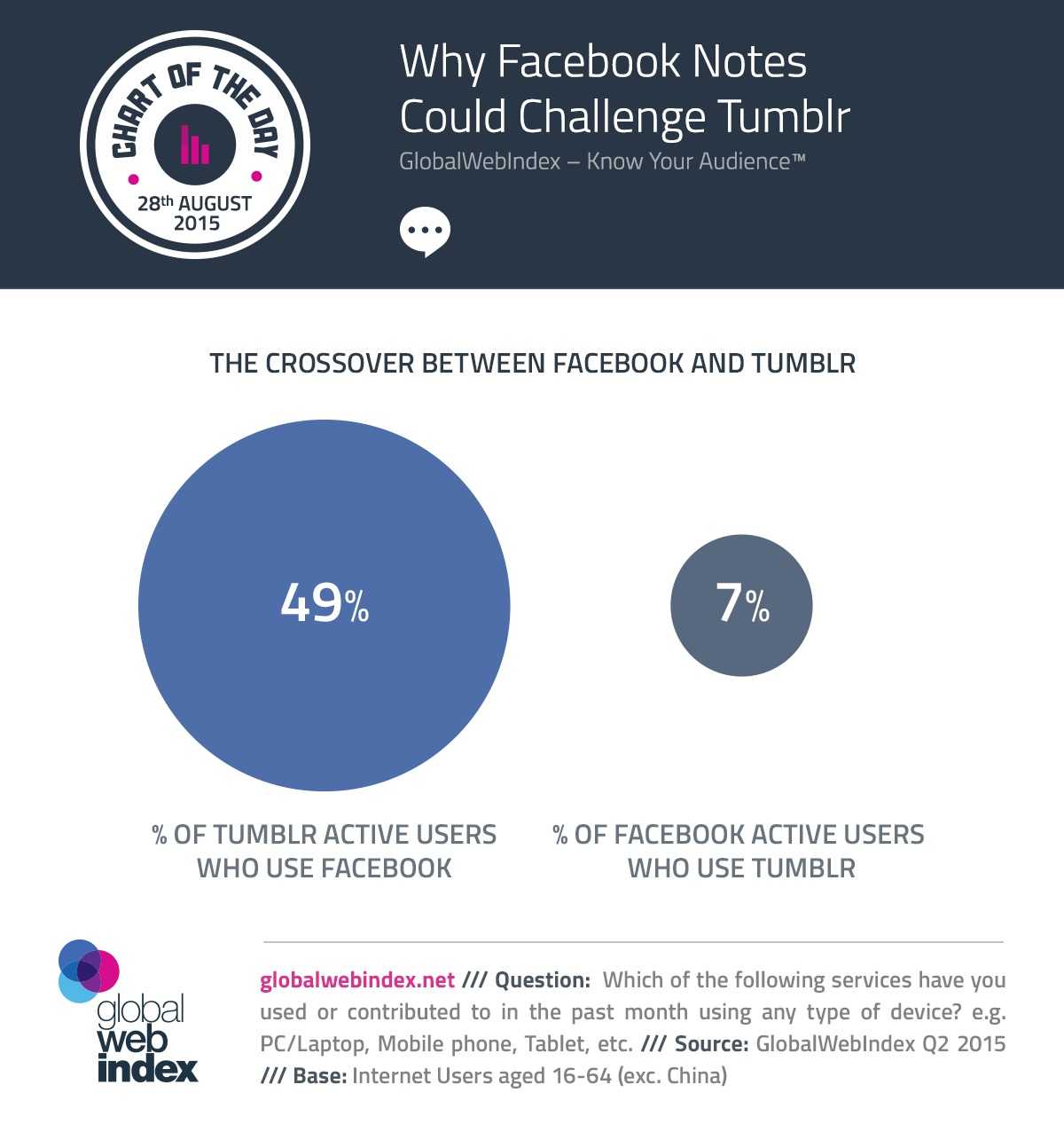 Facebook用户中使用Tumblr的只占7%。但是,Tumblr活跃用户中半数使用Facebook。