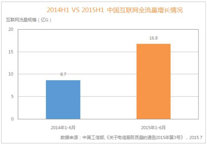 根据中国工信部的统计,2015年上半年互联网流量使用持续高速增长,1-6月累计达16.8亿G,同比2014年上半年的8.7亿G,增长了93%。