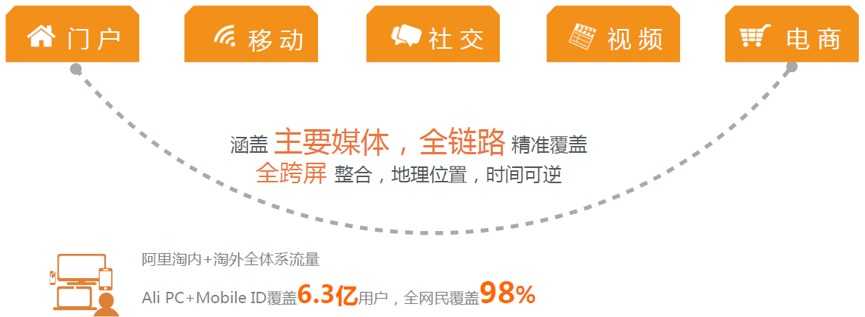 阿里妈妈拥有海量的营销资源,其范围已从淘内拓展到了淘外,实现了全域资源覆盖,用户全打通。阿里淘内+淘外全体系流量在PC和移动端已经覆盖6.3亿用户,覆盖了98%的中国网民。无论是淘内还是淘外,阿里妈妈可以帮助品牌商一站式触达门户、垂直、视频、电商、社交等所有主要优质资源,能够实现全链路、全跨屏的整合投放,并配合独家的定向手段,精准定位到消费者真人。