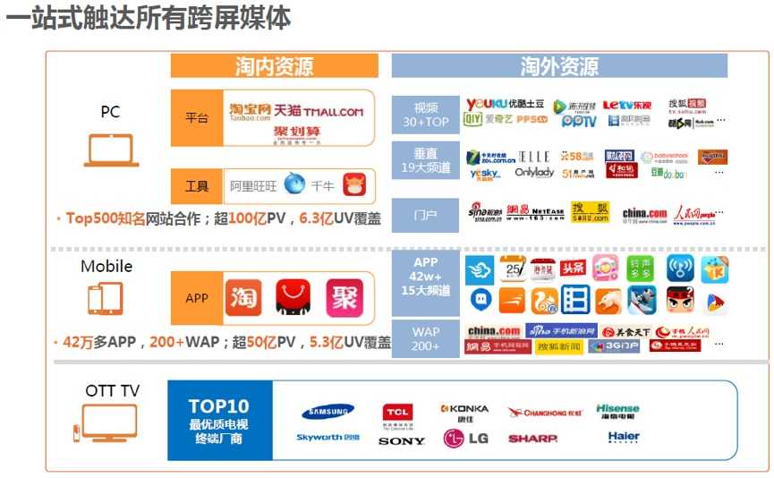 阿里妈妈真人全息大数据可用于投放于全网优质资源包括PC端、移动端、互联网电视端的流量已经每日超过200亿,资源覆盖所有品牌营销会用到的媒体类型:门户、视频、垂直、社交等,所有品牌主都可以通过阿里妈妈实现全域品牌营销。