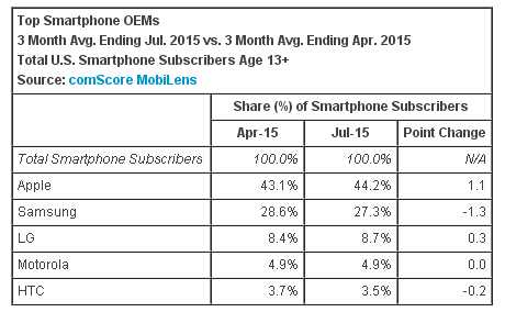 数据显示,在结束于7月15日的前三个月时间里,苹果iPhone在美智能机市场份额增长1.1个百分点、至44.2%;相比之下,同期三星智能机产品在美市场份额下滑1.3个百分点至27.3%。此外,LG智能机市场份额增长0.3个百分点至8.7%;摩托罗拉持平、份额依旧为4.9%;HTC份额下跌0.2个百分点至3.5%。