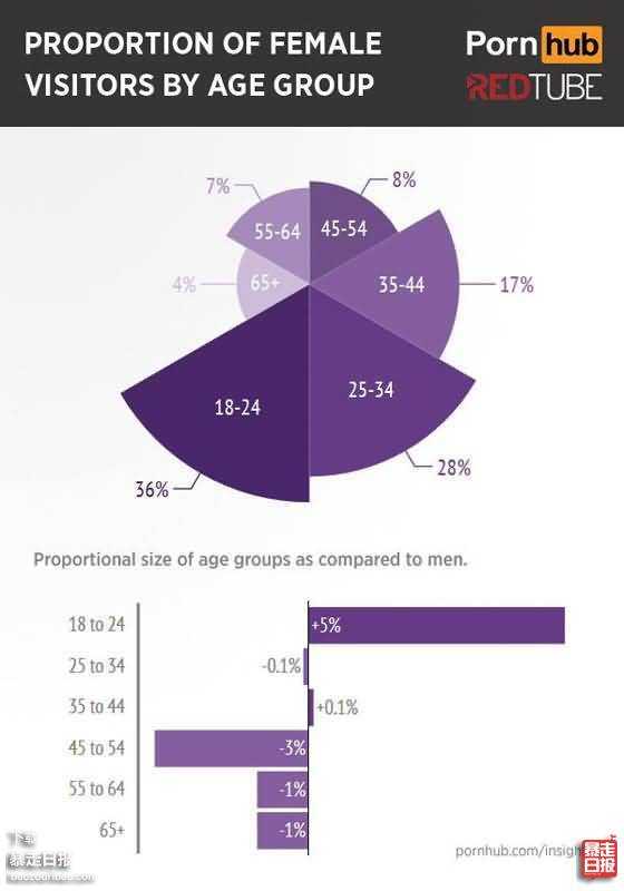 18-24岁的比例是36%(比同年龄段的男性还多5%),25-34岁的比例是28%(基本和同年龄段的男性一样,少0.1%),35-44岁的比例是17%(也是基本持平,多0.1%)