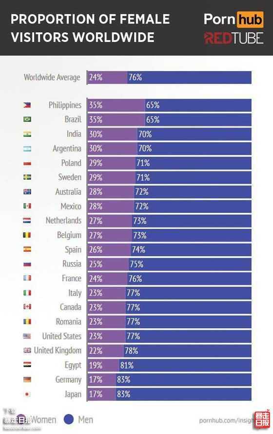 菲律宾和巴西的的女性比例高达35%,调查的国家中,日本的女性观看比例最低,只有17%.