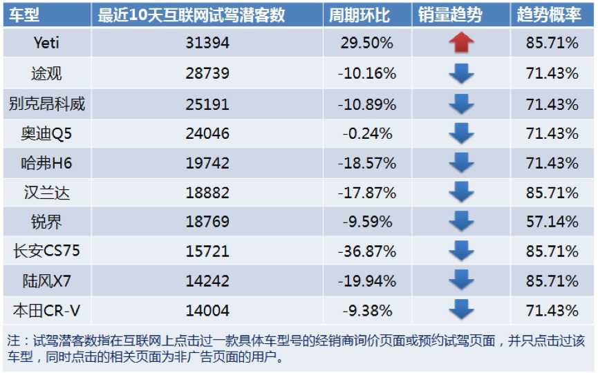 9月第二周SUV互联网用户关注量车型TOP10销量趋势预测