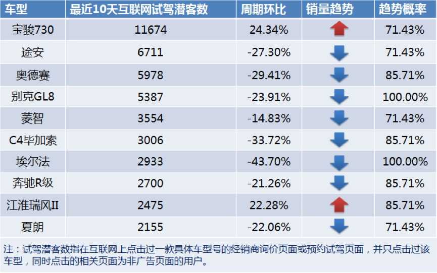 根据缔元信红渠汽车互联网营销数据库的试驾潜客数据,筛选出SUV、轿车和MPV下最近10天最受互联网购车用户关注的车型,并就这30款车型进行本周的销量趋势预测