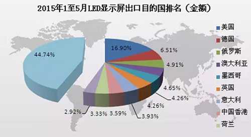 根据2015最新的海关统计数据显示,2015年1月~5月,中国出口led显示屏金额达到2.6亿美金,出口数量达44万台。其中,五月份出口金额约为5900万美金,占比约为前5个月总和的22.22%。