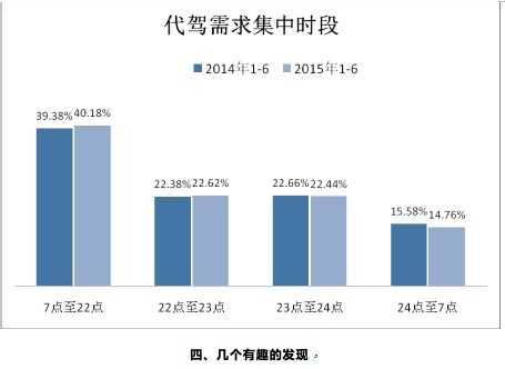 从2015年上半年数据来看,全国主要城市代驾需求集中时段仍以22点至24点区间为主,占比接近5成。不过白天的代驾需求有所增长,同比2014年上半年,7点至22点时间段产生的代驾需求提高了1%。