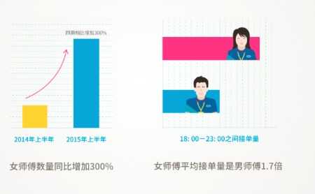 说起女司机,人们总是谈虎色变,但是女代驾司机和女司机并不是同一类。数据显示2015年上半年与2014年同期相比,女代驾司机数量同比增加300%,平均上线(18:00-23:00)接到订单量超男代驾师傅1.7倍。通过回访发现81%的用户愿意选女代驾师傅,与2014年同期相比增加20%。回访中了解到,大部分人感觉女司机的驾驶技术并不比男司机差,反而开的更稳,而叫女司机其中有大部分是女性用户,感觉找女代驾司机更安全,也有不少男性用户,感觉女代驾司机很”新奇“。