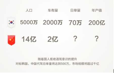 中国人喜欢韩剧和啤酒炸鸡,韩国人也喜欢羊肉串和中国啤酒,可见中韩两国人民在文化、生活很多方面有非常多相似之处。既然中韩两国人民在喝酒文化上如此相似,那么是不是有一天在酒后代驾这一行为方式上也会越来越一致呢?如果中国人酒后代驾的意识和韩国人相当的话,那么对比韩国代驾市场的发展情况,中国代驾市场的发展潜力如何呢?