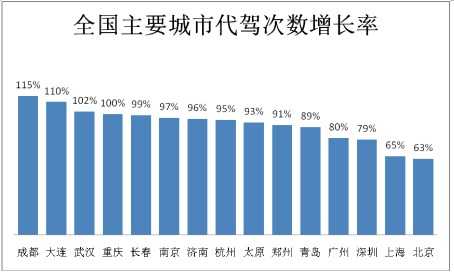 全国主要城市代驾次数增长明显,其中成都、大连、武汉、重庆等四个城市增长均超过100%。从整体数据看,二、三线城市代驾需求增长明显高于一线城市。