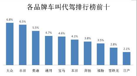 从汽车品牌分类,大众车车主最喜欢叫代驾,在所有汽车品牌里,大众以6.8%占比位居第一。其次是丰田和奥迪两大品牌的车主,分别以6.5%和5.5%分列二、三位。值得一提的是,在排行前10的汽车品牌中,并未看见国产轿车品牌。