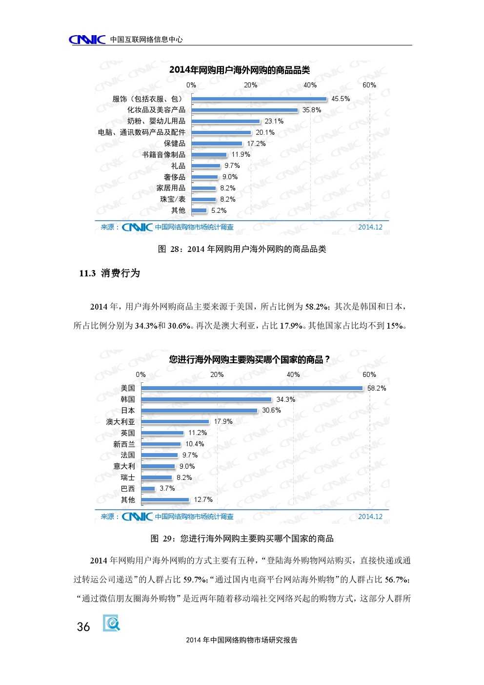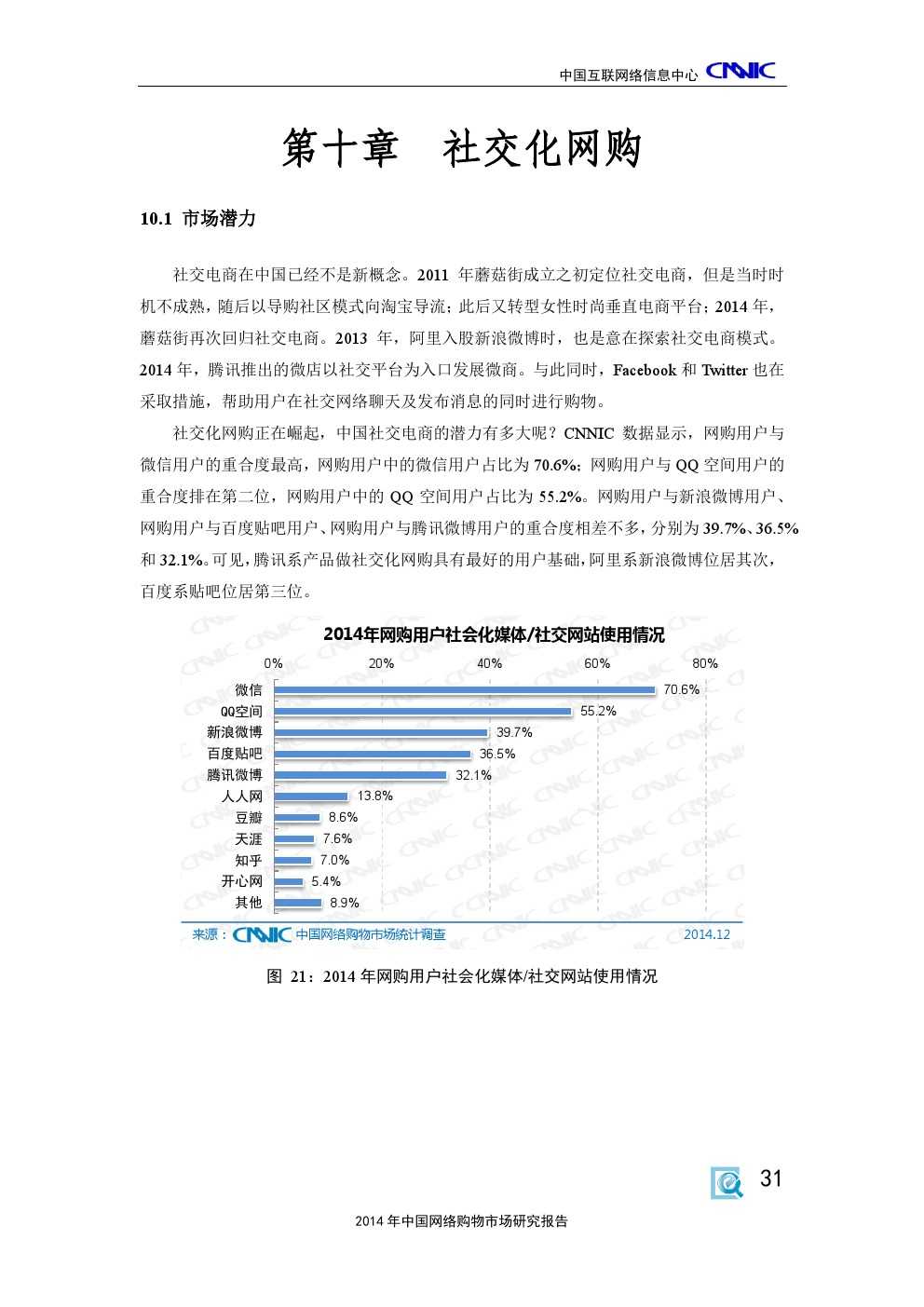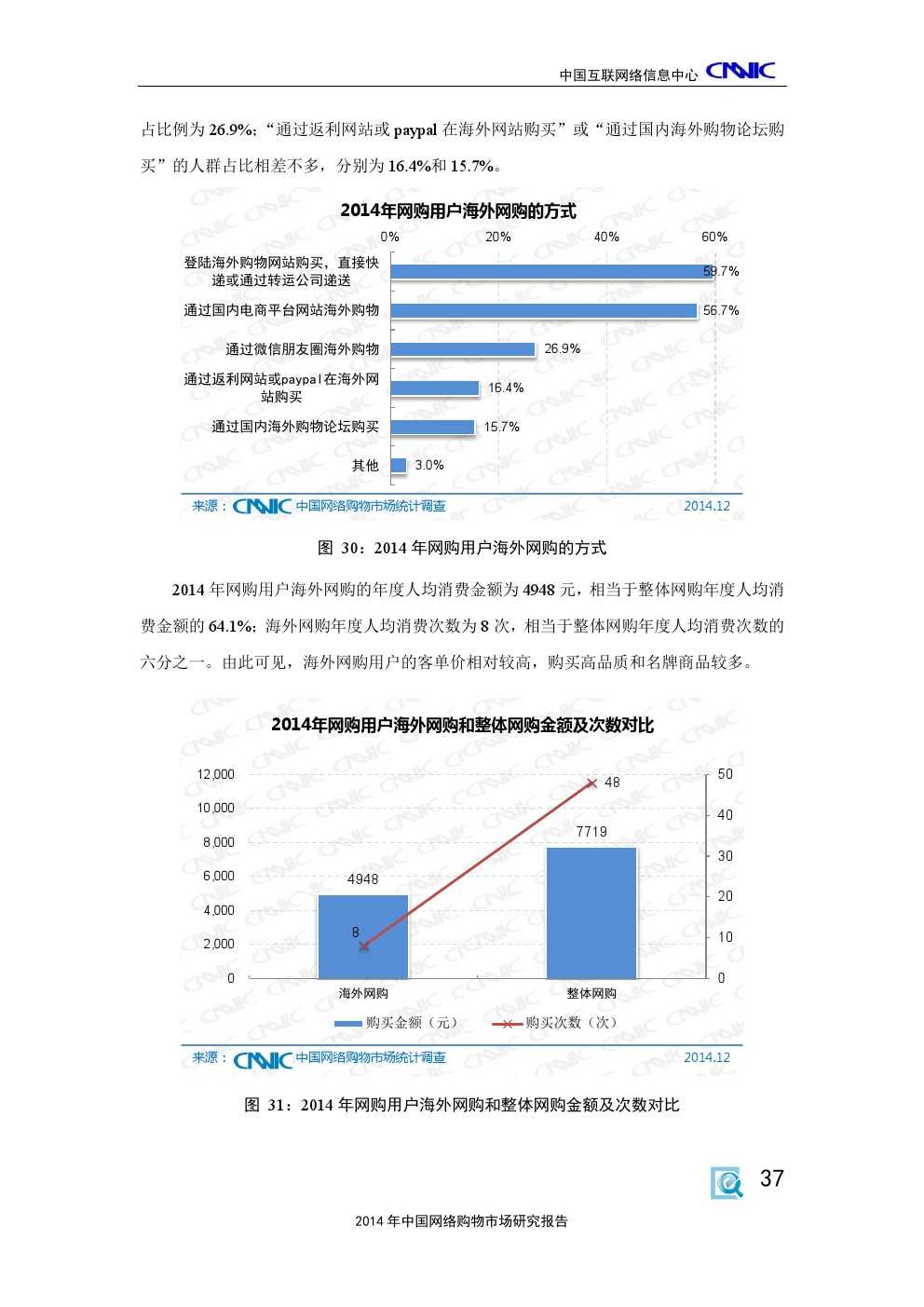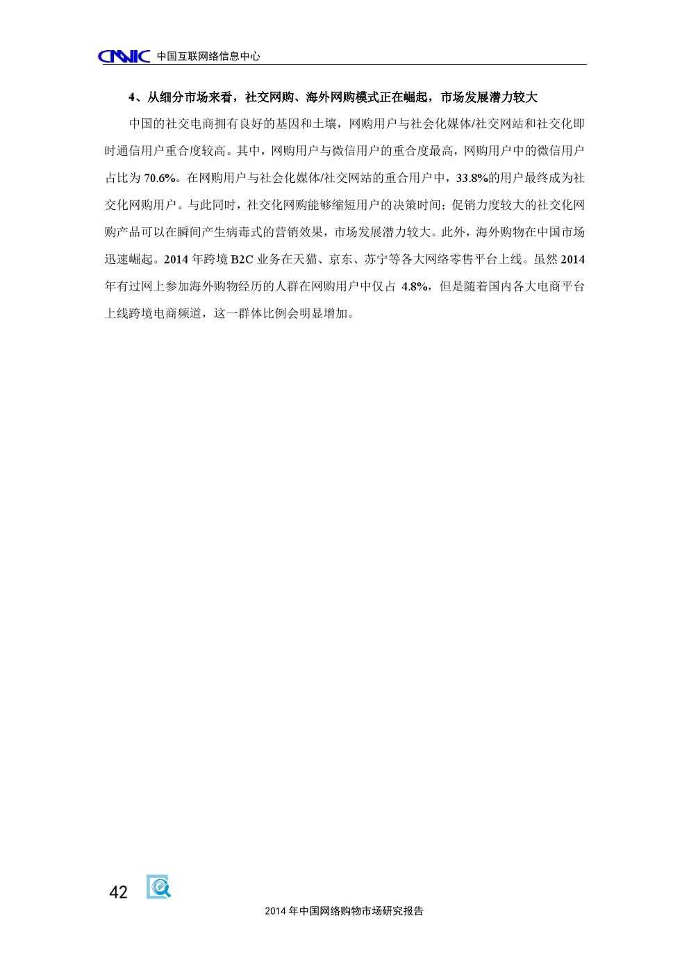 中国的社交电商拥有良好的基因和土壤,网购用户与社会化媒体/社交网站和社交化即时通信用户重合度较高。其中,网购用户与微信用户的重合度最高,网购用户中的微信用户占比为70.6%。在网购用户与社会化媒体/社交网站的重合用户中,33.8%的用户最终成为社交化网购用户。与此同时,社交化网购能够缩短用户的决策时间;促销力度较大的社交化网购产品可以在瞬间产生病毒式的营销效果,市场发展潜力较大。此外,海外购物在中国市场迅速崛起。2014年跨境B2C业务在天猫、京东、苏宁等各大网络零售平台上线。虽然2014年有过网上参加海外购物经历的人群在网购用户中仅占4.8%,但是随着国内各大电商平台上线跨境电商频道,这一群体比例会明显增加。