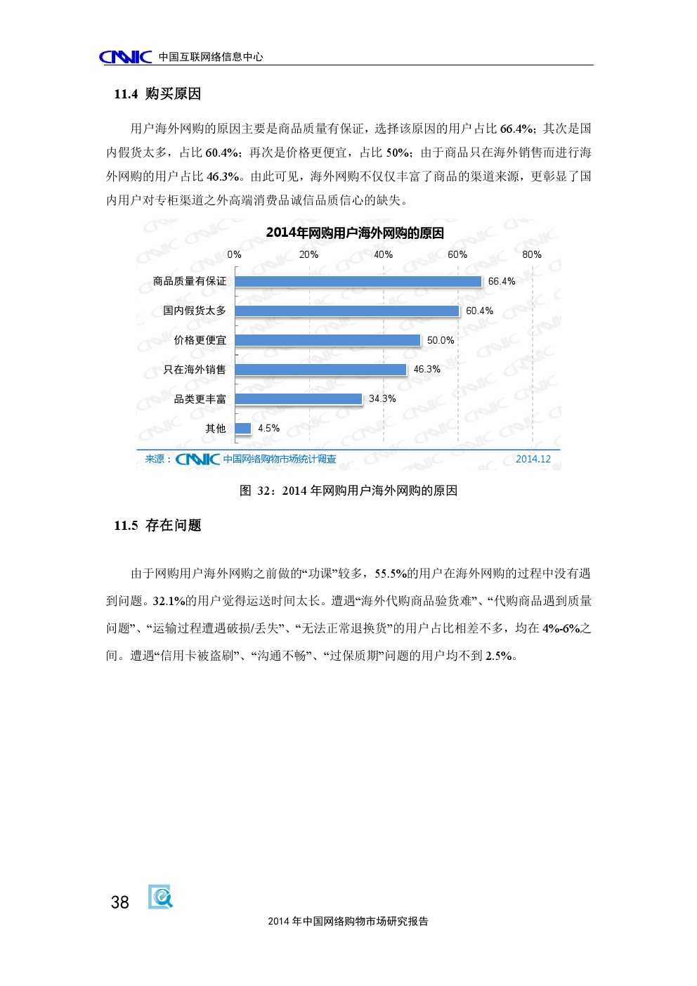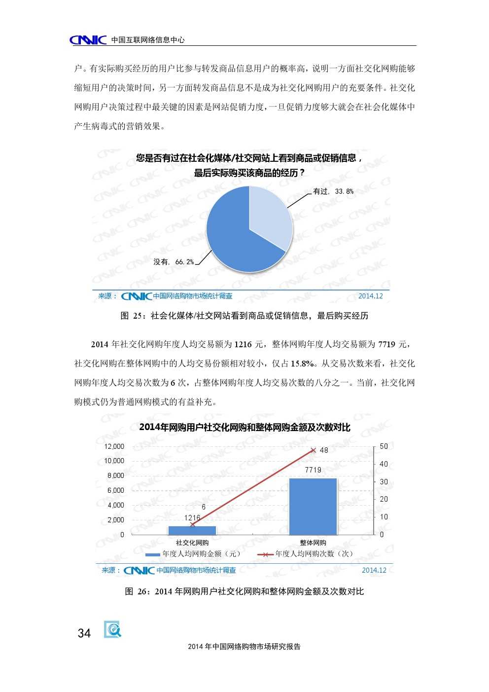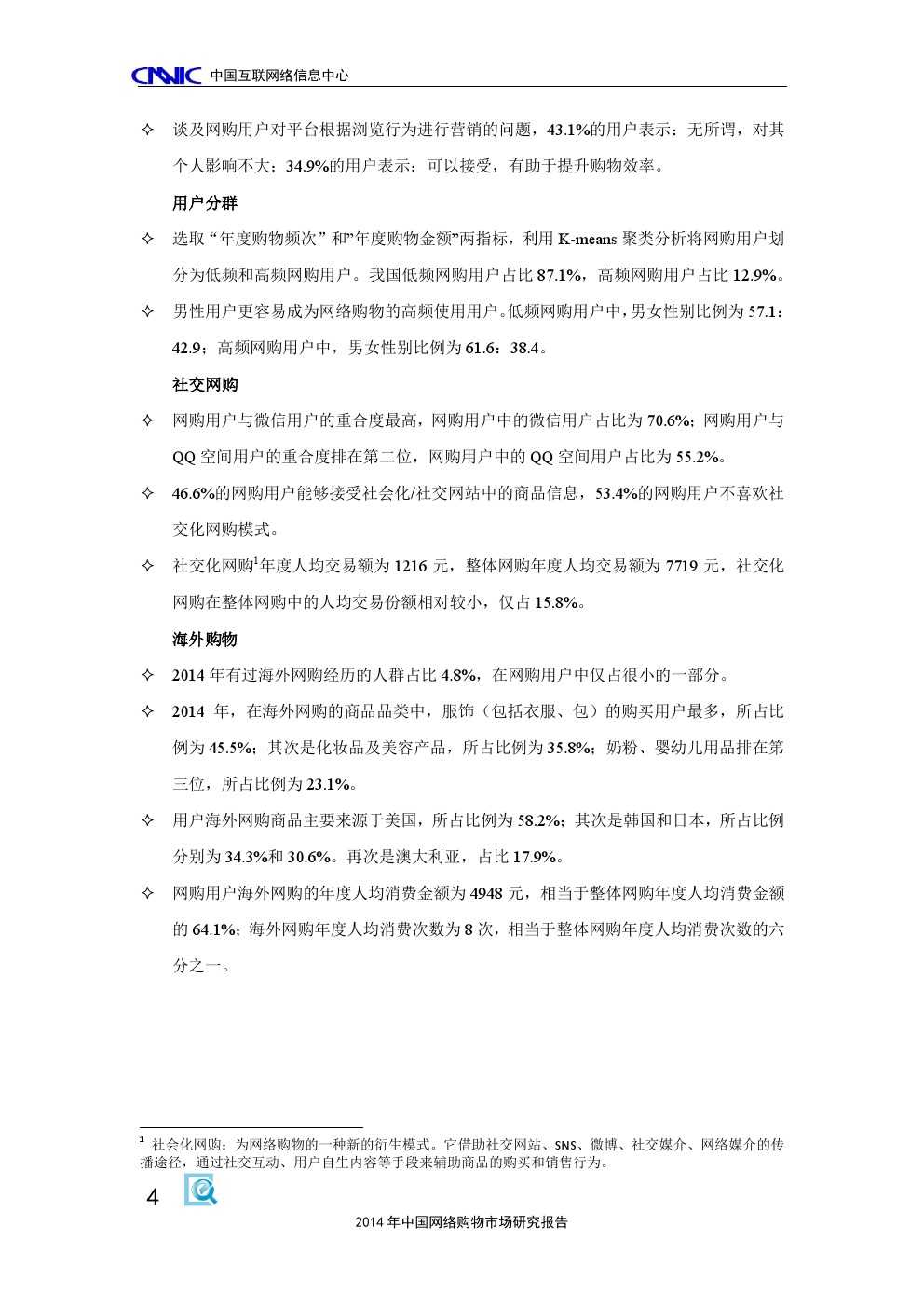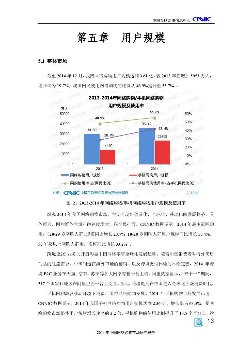 中国的社交电商拥有良好的基因和土壤,网购用户与社会化媒体/社交网站和社交化即时通信用户重合度较高。其中,网购用户与微信用户的重合度最高,网购用户中的微信用户占比为70.6%。在网购用户与社会化媒体/社交网站的重合用户中,33.8%的用户最终成为社交化网购用户。与此同时,社交化网购能够缩短用户的决策时间;促销力度较大的社交化网购产品可以在瞬间产生病毒式的营销效果,市场发展潜力较大。此外,海外购物在中国市场迅速崛起。2014年跨境B2C业务在天猫、京东、苏宁等各大网络零售平台上线。虽然2014年有过网上参加海外购物经历的人群在网购用户中仅占4.8%,但是随着国内各大电商平台上线跨境电商频道,这一群体比例会明显增加。