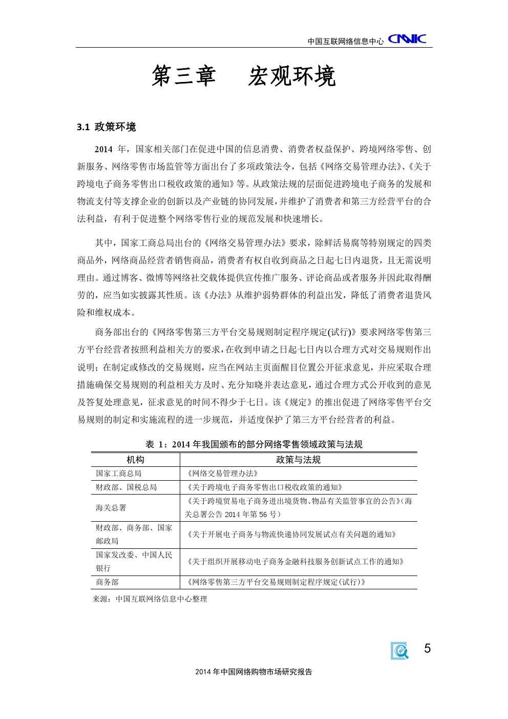 2014年,国家相关部门出台多项政策法令规范网络零售、跨境网络零售、移动端网络零售及物流、金融等产业,包括《网络交易管理办法》、《关于跨境电子商务零售出口税收政策的通知》、《关于开展电子商务与物流快递协同发展试点有关问题的通知》、《网络零售第三方平台交易规则制定程序规定(试行)》等。