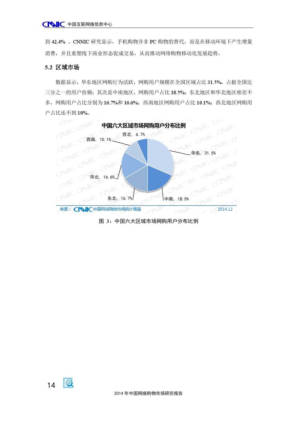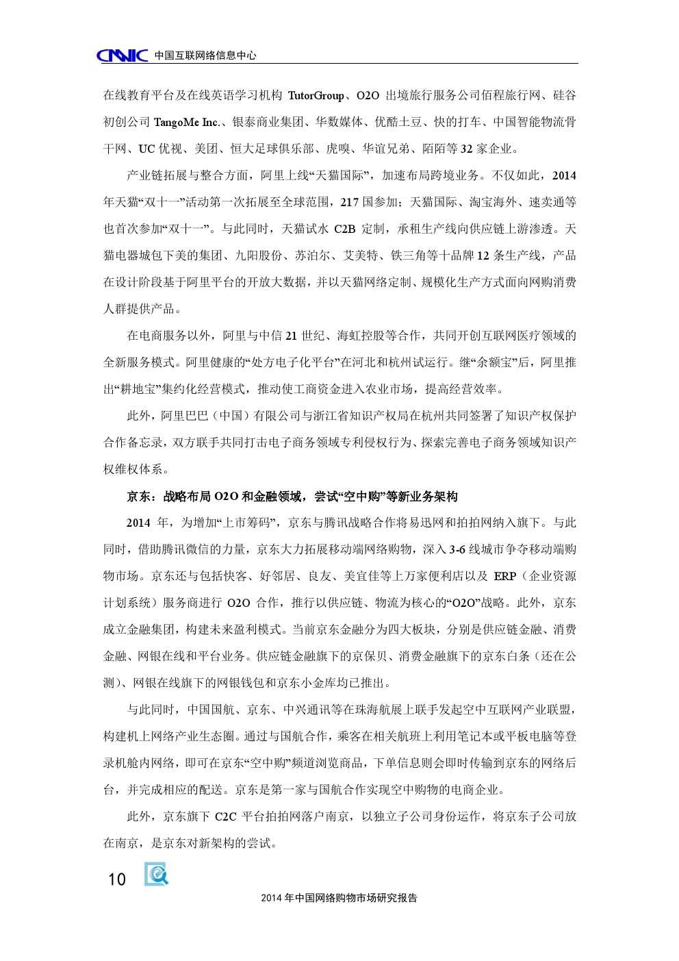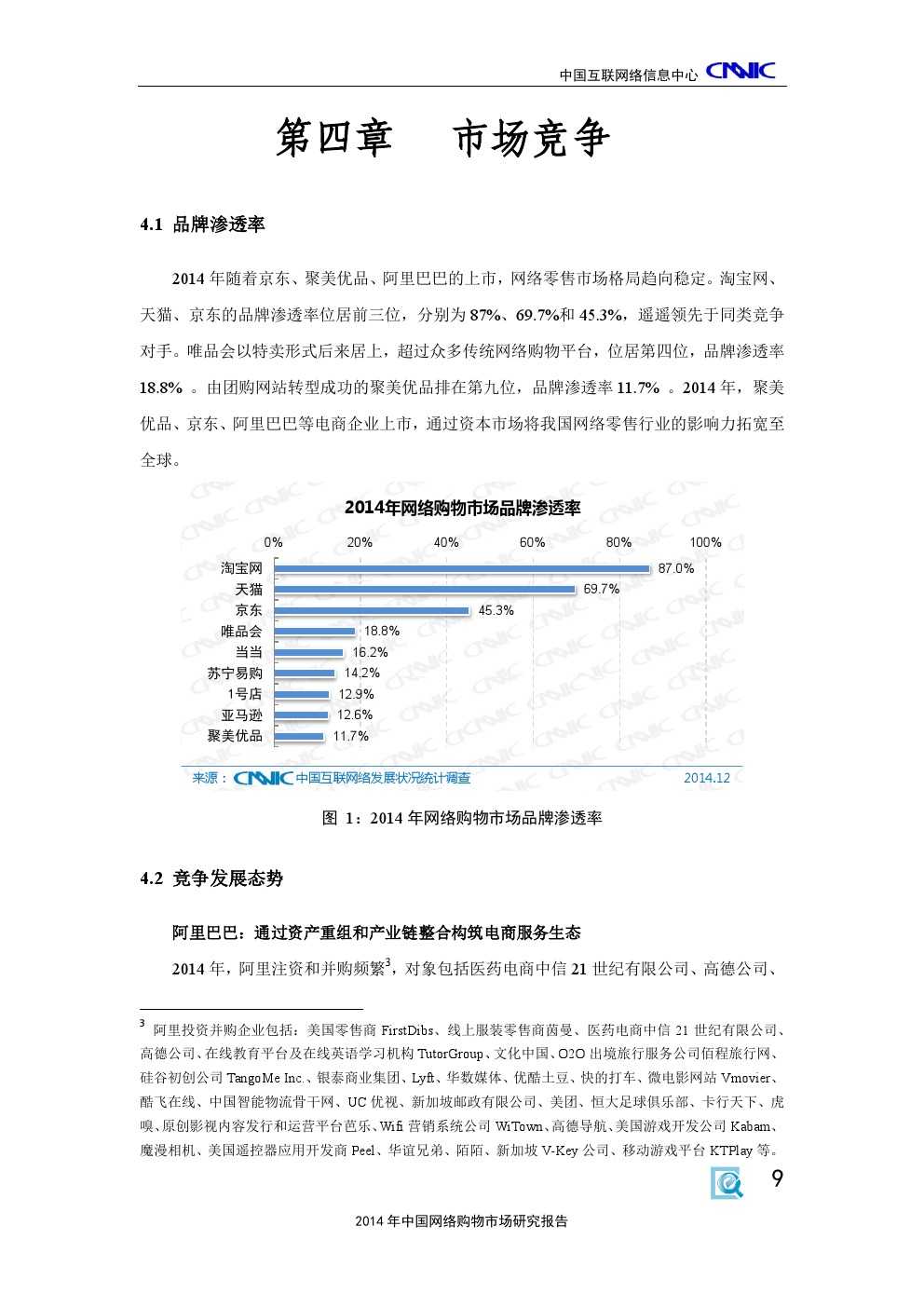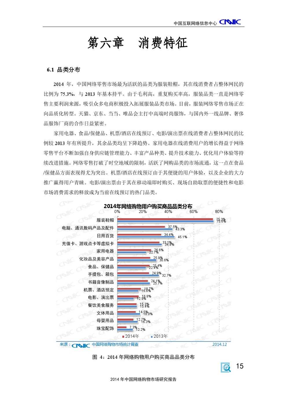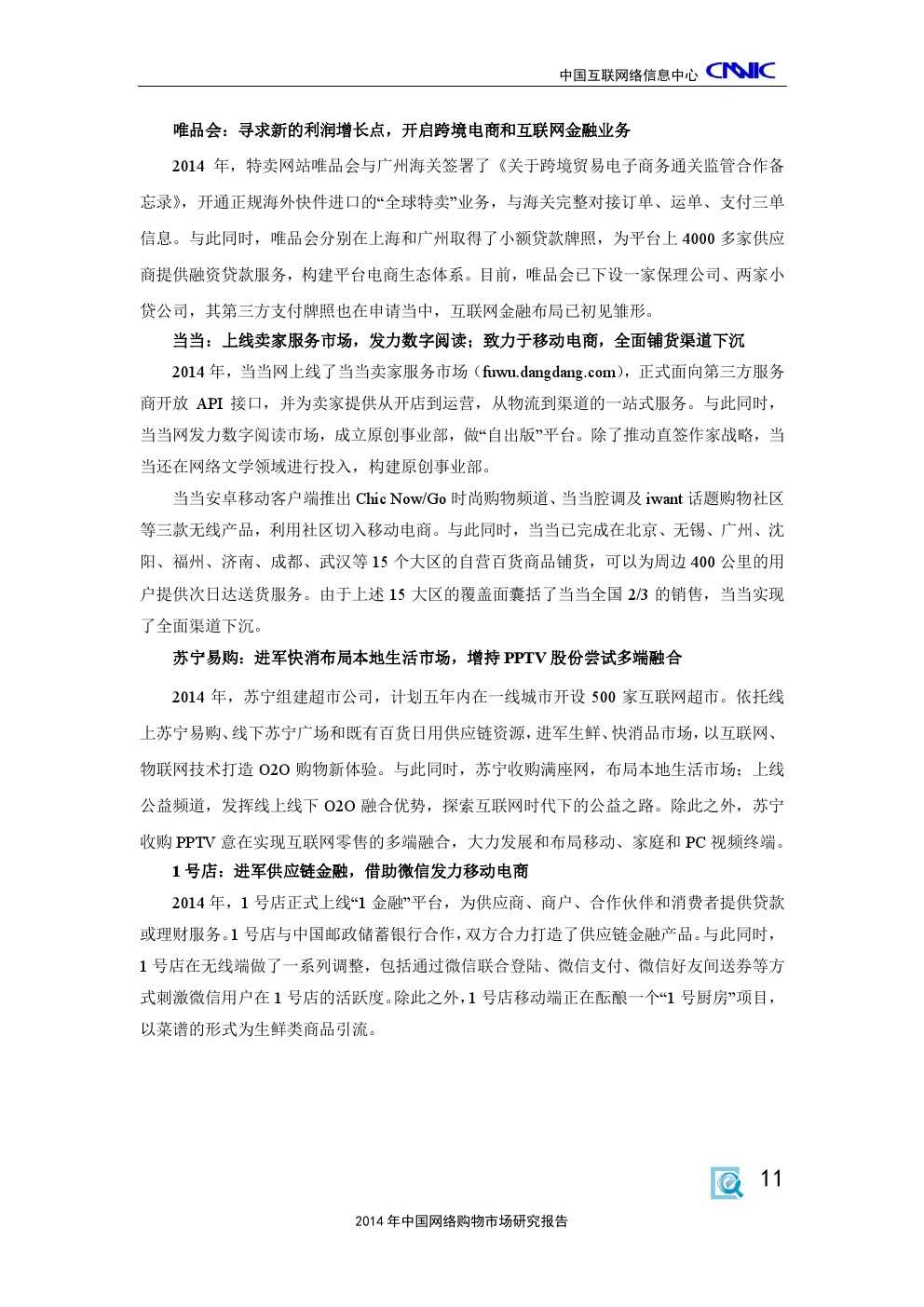 2014年,网络购物整体市场的用户规模在高位上仍保持千万级别的增长,普及率达到55.7%。与此同时,手机网络购物市场发展迅猛,用户年度增长率为63.5%;手机购物市场用户规模增速是整体网络购物市场的3.2倍。电商市场的持续繁荣,促使企业加速战略布局。阿里巴巴通过资产重组和产业链整合构筑电商服务生态;京东战略布局O2O和金融领域,尝试“空中购”等新业务架构;唯品会寻求新的利润增长点,开启跨境电商和互联网金融业务;当当上线卖家服务市场,发力数字阅读,致力于移动电商,全面铺货渠道下沉;苏宁进军快消布局本地生活市场,增持PPTV股份尝试多端融合;1号店进军供应链金融,借助微信发力移动电商。