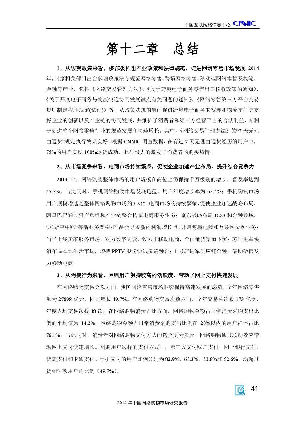 从政策法规的层面促进跨境电子商务的发展和物流支付等支撑企业的创新以及产业链的协同发展,并维护了消费者和第三方经营平台的合法利益,有利于促进整个网络零售行业的规范发展和快速增长。其中,《网络交易管理办法》的“7天无理由退货”规定执行效果良好。根据CNNIC调查数据,在有过7天无理由退货经历的用户中,75%的用户实现100%退货成功,此举极大的激发了消费者的购买热情。