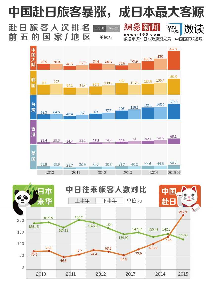 据日本政府观光局的数据,2015年上半年,赴日中国大陆旅客人次达到217.9万,位居世界第一,仅今年上半年的人数就已经和2014年整年持平,且比2014年以前任何一年的总数还多。韩国排名第二,人数为181.9万。台湾、香港和美国分别以179.2万、69.1万、50.7万紧随其后,这五个国家和地区一直排在赴日旅客数量的前五位。这是中国第一次成为日本最大外客来源,但这一趋势并不出人意料。