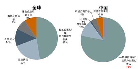在毫无准备的情况下,默许或者提倡员工自带设备进行办公时,用户会访问个人社交网络、下载喜好的App程序、浏览网页,而同一个设备还会访问企业内部的关键数据。但由于企业的机密数据对黑客来说则更加吸引力和卖点,因此他们会利用APT攻击技术侵入不设防的移动终端、获取接入企业云计算环境的账号和密码。利用这些账号发现漏洞,最终盗取核心数据,这确实会让人感到毛骨悚然。报告中的数据真实的反馈了这一情况,不过值得注意的还是中国,78%的用户在关注“敏感数据和/或用户数据的丢失”的风险,这远远高于47%的全球平均值。
