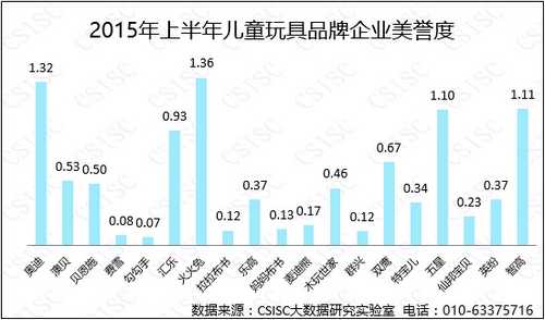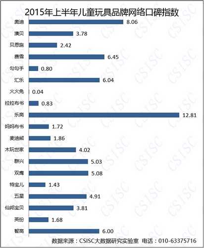 数据显示,2015年上半年儿童玩具品牌口碑总指数整体变化不大,乐高再次取得较好的成绩,与2014年相比,品牌口碑指数成绩互有更迭,研究序列的其他品牌之间差距不大。但是,品牌口碑集中度有逐渐提高的趋势,品牌生产企业应加强对自身品牌口碑的营销管理。
