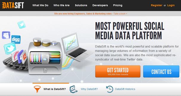 公司帮助开发商以及第三方访问Twitter,Facebook及其它社交数据资源,Datasift最特别的地方在于,它能对几十亿社交接口进行分类,将数据过滤为人口信息,在线影响力,敏感信息,积极或消极信息等。