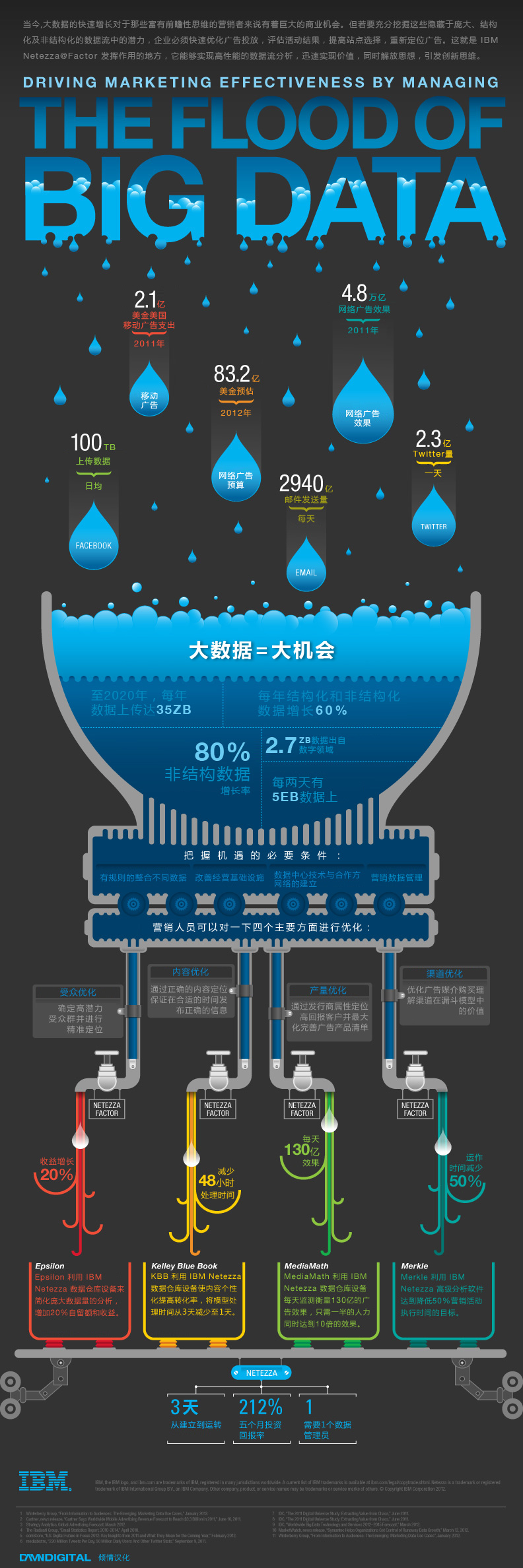 IBM的Netezza@Factor就是这样一款产品,它能够实现高性能的数据流分析,迅速实现价值,同时解放思想,引发创新思维。IBM利用一系列的数据以及产品创造的后续效果为内容,制作而成的信息图,在巧妙推销其产品的同时,告诉我们大数据时代的到来将为商业创造的无数潜在机会可能。