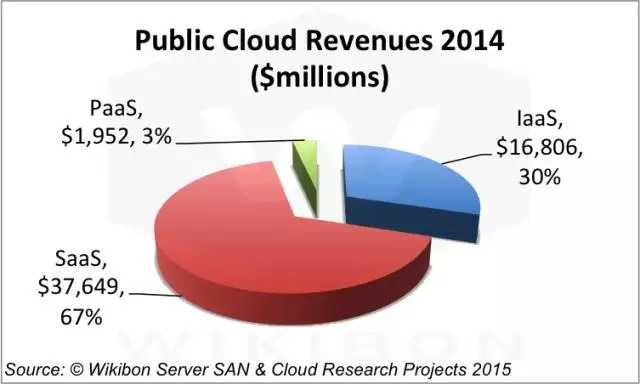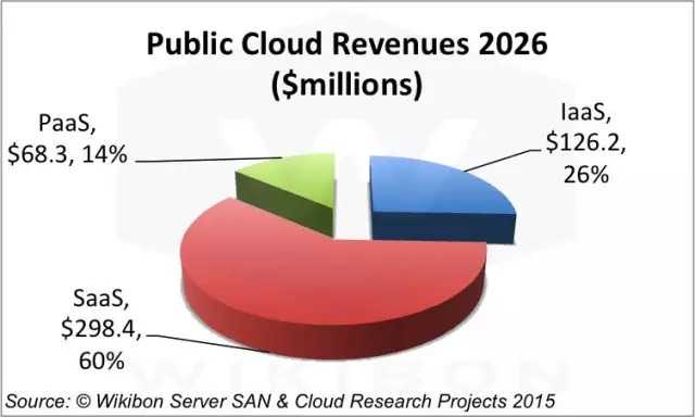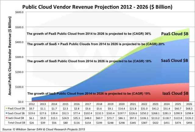 Wikibon最新报告《Public Cloud Market Forecast 2015-2026》提到:从2015年到2026年,全球公有云市场规模将保持20%的复合增长率,2026年达4930亿美元。其中,PaaS、SaaS、IaaS的年度复合增长率分别为36%、18%和19%。