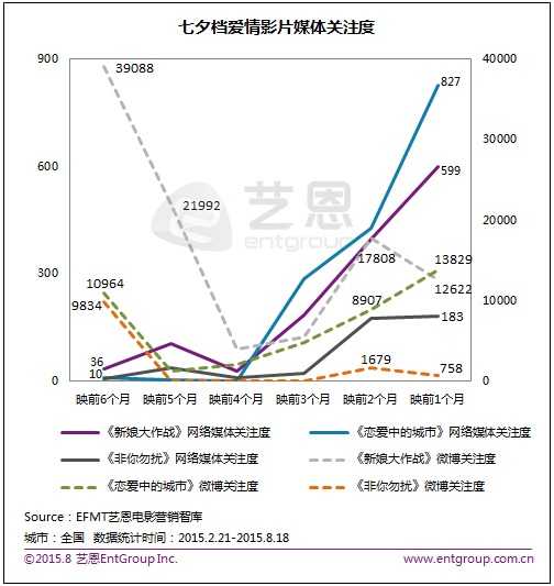 根据EFMT艺恩电影营销智库显示, 2015年七夕档在映的三部爱情电影,网络媒体关注在映前6个月较低,映前3个月开始大幅度上涨。尤其《恋爱中的城市》和《新娘大作战》增长势头更为迅猛。微博关注度与网媒关注度趋势存在差异,三部影片在映前6个月的微博讨论量都较高,《新娘大作战》达到映前6个月内的最高值。目前看来,《非你勿扰》的网络媒体和微博关注度均低于对手。