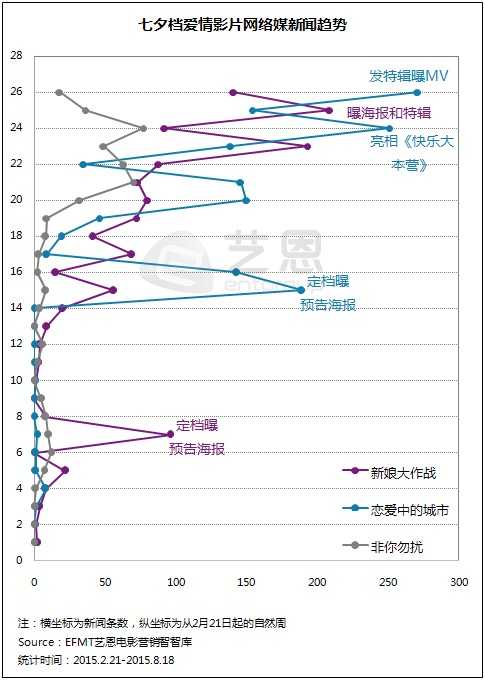 根据EFMT艺恩电影营销智库显示,从2月21日开始截至8月18日的半年时间里,《恋爱中的城市》相关网络新闻总量达到1512条,《新娘大作战》为1295条,前者是后者的117%,《非你勿扰》则仅有429条。从走势图来看,《新娘》战线较长,走势稳中有升,而《恋爱》营销行为趋于集中,单周高峰为三片之最,但曲线波动较大,暴涨暴跌,网络新闻总量亦为最多的一部影片。