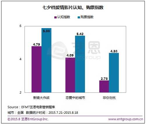 根据EFMT艺恩电影营销智库数据显示,《新娘大作战》的认知和购票指数高于其他两部,目前市场反响最好,预测会有上佳表现。《恋爱中的城市》的认知、购票指数均低于《新娘大作战》,尤其在认知方面差距较大,建议该片加大宣传推广力度,尽快提高受众认知。《非你勿扰》无论认知还是购票指数均明显低于对手电影,情况堪忧。