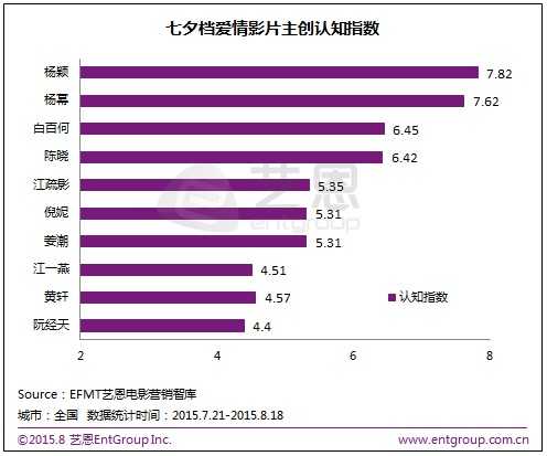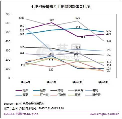 据EFMT艺恩电影营销智库显示,在众主演人员近一个月以来的认知指数中,《新娘大作战》的主演杨颖、陈晓和《恋爱中的城市》的主演杨幂、白百何认知指数明显高于其他艺人。网络媒体关注度方面,杨颖、杨幂、白百何位居前三,与认知指数的排名一致。