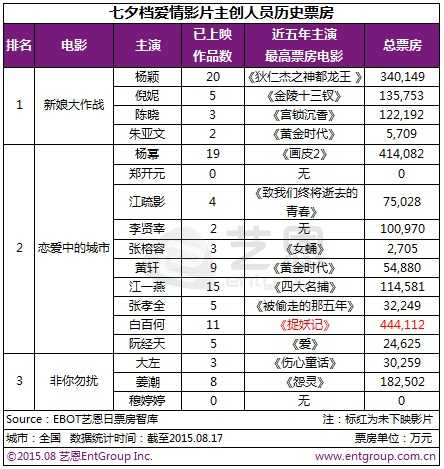 根据EBOT艺恩日票房智库显示,今年七夕在映的爱情电影中主创人员的票房实力整体表现不俗。因综艺节目《奔跑吧兄弟》人气飙升的杨颖,已经上映的作品数量最多,属于高产艺人;杨幂的成名作是2011年的电视剧《宫》,之后她开始逐渐转战电影市场,主演的电影作品大多数票房较高;白百何因为今年暑期档电影《捉妖记》的票房大爆发,一跃成为国产电影票房女王;而李贤宰作品数量虽少,但凭借参演《小时代3:刺金时代》和《小时代4:灵魂尽头》两部大卖影片,总票房超过十亿,潜力较大。从主创人员的历史票房上看,《恋爱中的城市》主演众多且票房实力较高,总体实力超过《新娘大作战》。