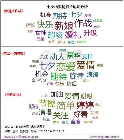 综合比较三部影片,据EFMT艺恩电影营销智库显示,《新娘大作战》讲述了闺蜜杨颖与倪妮为了实现婚礼梦想而斗智斗勇的故事,受众的热议词中,“女神”、“七夕”、“作战”、“婚礼”、“火热”等被较多提及,影片信息传达比较到位。
