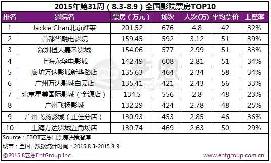 据EBOT艺恩日票房智库数据显示,第31周全国影院冠军为Jackie Chan北京耀莱,总票房为201.52万元,票房同比上升26%,环比下降21%,上座率为32%。亚军为首都华融电影院,该影城票房同比上升仅1%,为TOP10影城中最低。本周各影城票房环比均为下降趋势,下降幅度在20%左右,下降最多的为广州飞扬影城(正佳分店),环比下降32%,排名由上周第四名降至本周第九名。