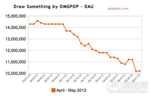 据pocketgamer报道,The Atlantic Wire撰稿人Dashiell Bennett最近引用AppData数据指出,Zynga热门手机游戏《Draw Something》目前DAU已下滑至1000万左右(注:Develop报道称该游戏自OMGPOP被收购以来已流失将近500万日活跃用户,它在4月3日最高峰时的日活跃用户为1430万,但目前已下滑至1040万)。