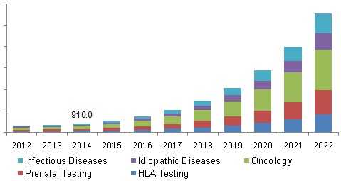 根据Grand View Research的报道,2014年全球下一代测序(NGS)市场规模为20亿美元,预计在2015年至2022年,市场值以40.1%的年复合增长率增长,至2022年市场值达300亿美元。