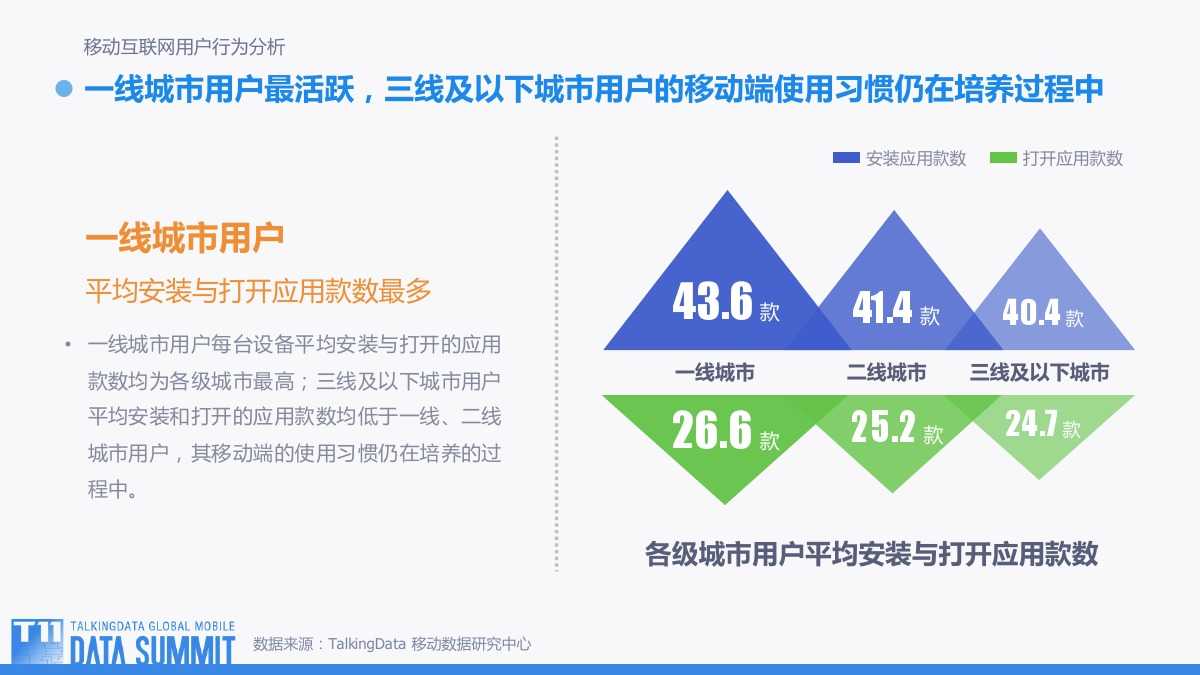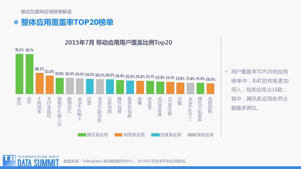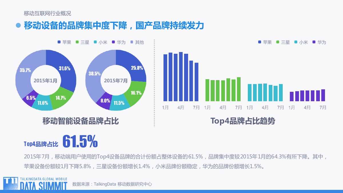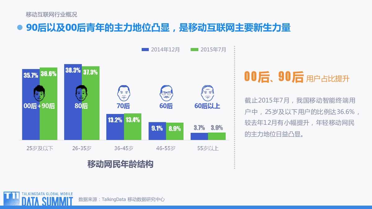 TalkingData:2015移动互联网行业趋势盘点 更多阅读:TalkingData:2014移动互联网数据报告(完整版)TalkingData:2015年上门O2O移动应用行业报告TalkingData:2015年出行O2O移动应用行业报告TalkingData:2020年“超职季”招聘市场洞察报告中国信通院:2025年前10月移动互联网流量3232亿GB,同比增长16.8%GSMA:2025年数字国家报告GSMA:2025年移动互联网报告中国信通院:2025年8月末我国移动互联网用户数16.01亿户QuestMobile:2025年6月华为活跃用户2.88亿居首QuestMobile:2025年上半年中国移动互联网月活12.67亿工信部:截至2025年6月末我国5G基站总数达455万个 用户普及率超79%QuestMobile:2025年5月移动互联网月活12.62亿,同比增长2.2%QuestMobile:2025年5月插件AI应用月活5.8亿,增速106%2025年全球64%网络流量来自智能手机QuestMobile:2025年3月中国移动互联网月活达12.59亿,同比增长2.2%