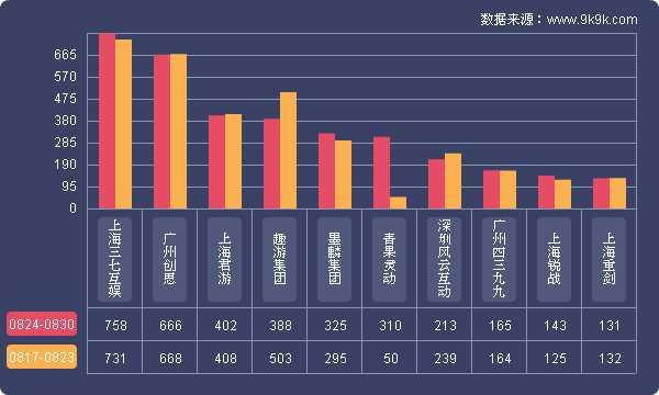 点评:本周网页游戏一线平台开服前三平台为37游戏、360游戏、9377;9377本周开服总量增加5.9%,排名上升两位;本周一线平台开服5652 组,较上周增加了2.9%;引进新游共14款。运营平台榜单开服3030组,占一线平台开服总数53.6%;其中开服前三平台共开服1362组,占榜单开服总数44.9%。金山猎豹《勇者盟约》于本周开启首测。漫长的暑假即将结束,各平台的开服力度也随着开学季的临近而做着最后的冲刺,因此本周众多平台开服总量均有明显的上升。