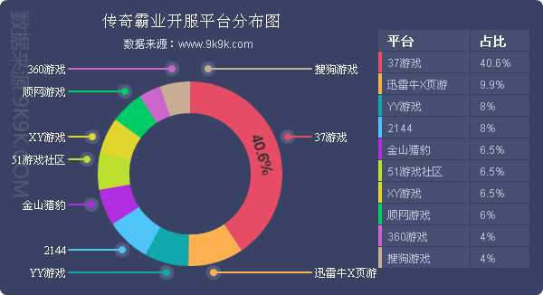 37游戏本周开服总量呈现较大幅度增长,调整主打游戏《传奇霸业》、《诸神黄昏》,开服占比增加了0.3%、0.8%;同时新游《众神之神》入驻37游戏,是其开服总量上升的主要原因。