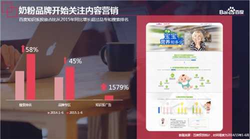 对于奶粉这样一个长决策链品类,行业客户除了继续加大在关键词和品专上的投入,也更加关注内容建设了,今年以来知识系广告投放同比去年增长1579%。如何在百度平台,开展与用户检索行为更紧密相关的内容营销,将是接下来的行业营销课题。