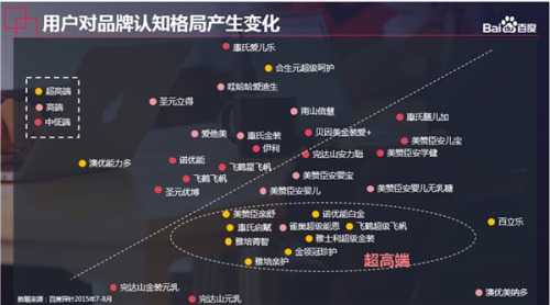 将市面上所有奶粉品牌进行对比分析发现,用户对于超高端品类已经形成清晰认知,而高端品牌被上下两级品牌拉扯,界限模糊。