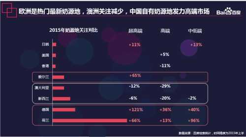 代表奶粉品质的奶源关注也在发生变化。受新西兰奶粉事件影响,澳洲奶源地品牌在三级市场的检索需求均遭遇滑铁卢。相反,以荷兰、德国为代表的欧洲奶源地品牌关注度大幅提升。