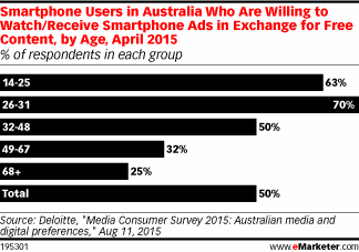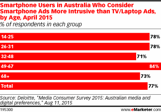 根据2015年4月 Deloitte的调查,绝大多数澳大利亚智能手机用户认为手机上的广告比电视和PC上的更烦扰。32到48岁的受访者抱怨比例最低,但是也有71%的人认为智能手机广告更烦人。
