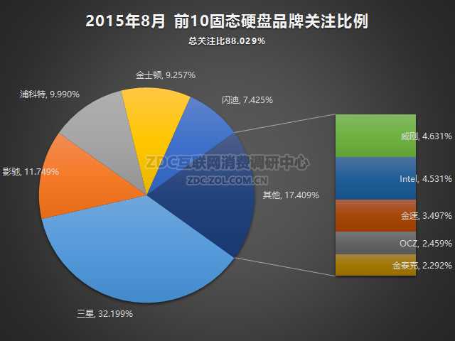 2015年8月中国的固态硬盘市场中,三星以32.199%的关注比例继续领跑,影驰和浦科特获得第二和第三,关注比例分别为11.749%和9.990%。金士顿的关注度比例为9.257%排名第四,与第三名的浦科特仅仅只有0.733%的差距。闪迪占比7.425%排名第五。其它热门品牌还有威刚,Intel,金速,OCZ和金泰克,关注比例在2%-5%之间。关注度为前十名的品牌占据了固态硬盘88.029%的关注比例。