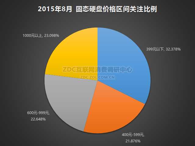 2015年8月中国固态硬盘市场上,中低价位的固态硬盘关注度高。其中,399元以下产品的关注度比例为32.378%,最受欢迎,600元-999元关注度占比22.648%,400元-599元比例21.876%。综上,1000元以下的中低端产品吸引了近八成的市场关注度,而1000元以上的产品关注比例只有23.098%。