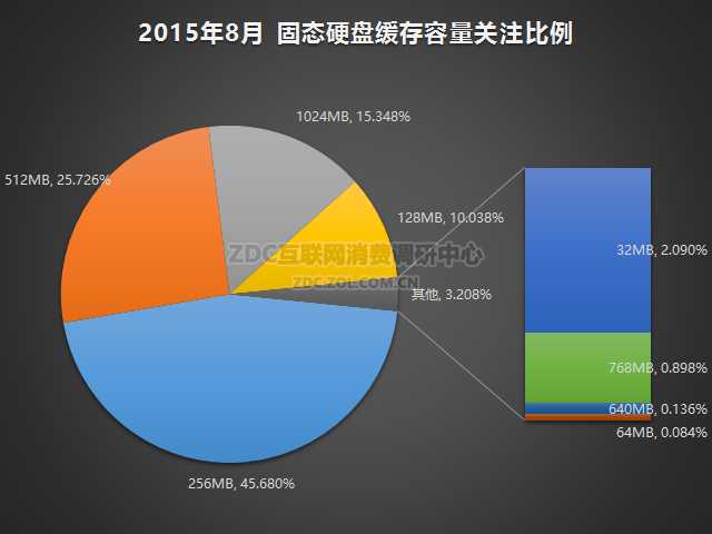 2015年8月中国的固态硬盘市场上,缓存容量为256MB的硬盘最受关注,占比达到45.680%。其次是512MB缓存容量的固态硬盘,关注比例为25.726%,1024MB缓存的固态硬盘的关注比例为15.348%,128MB占比10.038。这几种缓存容量的固态硬盘几乎吸引了消费者所有的关注度。其它类型的固态硬盘只占据3.208%的市场关注比例。