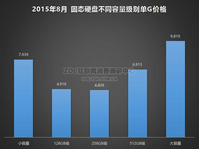 从单G价格来看,2015年8月中国的固态硬盘市场上,256GB的固态硬盘具有最低的单G价格,4.809元/G,128GB的固态硬盘单G容量与256GB容量非常接近,为4.916元/G。512GB级固态硬盘容量单G价格为6.913元/G。而小容量固态硬盘的单G价格比较高,为7.939元/G。单G价格最高的固态硬盘为大容量固态硬盘,价格为9.819元/G。可见,256G的固态硬盘仍然是当前市场的主流。