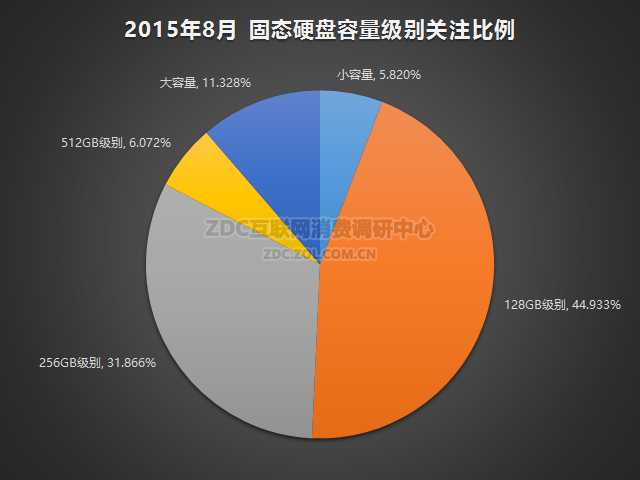 随着技术的不断发展和新产品的推出,固态硬盘的容量也变得越来越大。2015年8月的中国固态硬盘市场上,128GB产品的关注度最高,达到44.933%,其次是256GB级别固态硬盘,关注度为31.866%。512GB级别固态硬盘关注度为6.072%。大容量内存关注度占比为11.328%,而小容量内存关注度占比为5.820%。